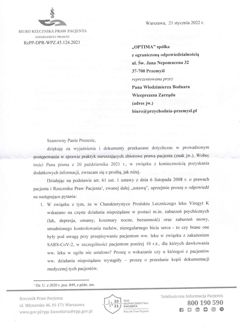 Niedługo minie już 10 miesięcy, od kiedy wszczęto postępowanie przeciwko naszej przychodni, zarzucając nam „zbiorowe naruszenia praw pacjentów”. Zostało ono wszczęte, bo „docierały niepokojące informacje […] dotyczące zagrożenia bezpieczeństwa zdrowotnego pacjentów” [1]. Dzisiaj wiemy, że nie byli to pacjenci, ale Narodowy Fundusz Zdrowia i jeden z tamtejszych dyrektorów [2]. Jednocześnie postępowanie zakończyło się w październiku, gdzie poinformowano nas, że Rzecznik zebrał komplet dokumentów do wydania decyzji. Zgłosiliśmy szereg zastrzeżeń do zebranego materiału dowodowego. Mimo to, biuro Rzecznika Praw Pacjenta deklarowało wówczas, że finał sprawy będzie jeszcze w 2021 roku. [3]