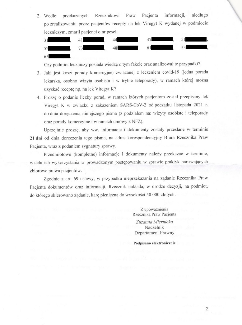 Tak się jednak nie stało. Blisko po 3 miesiącach od zgłoszenia uwag do zebranego materiału dowodowego otrzymaliśmy kolejne pismo, które nijak ma się do wcześniejszych ustaleń i zebranych materiałów. Co było powodem? Można tylko przypuszczać, że obecne dowody skończyłyby się uniewinnieniem i zakończeniem sprawy. Jednak widocznie nie chodzi o ustalenie prawdy , a na skazaniu, bo wyrok został już dawno wydany? Bo czym innym można uzasadnić blisko 3-miesięczną zwłokę, która zarazem jest granicą unieważnienia postępowania ze względu na brak działań urzędników. Te ruchy można uznać co najwyżej za pozorowane i mające na celu przedłużenia śledztwa? Sugestia skutków ubocznych po leku, które są również typowymi objawami COVID, czy sugerowanie powiązania zgonu z przyjęciem leku można odbierać jako kolejną nieudolną próbę przedłużenia śledztwa. A wplątywanie elementów komercyjnych i potencjalne ‘wyliczenie zarobków przychodni w związku z COVID’ ma tutaj także wymiar medialny. Może to będzie kalkulatorem do wymierzenia kary i z odpowiednim mnożnikiem da 5 Milionów złotych? Wszak przychodnia i lekarze powinni pracować za darmo, zwłaszcza gdy są pacjenci, którzy do nas trafiają, nie otrzymała wcześniej żadnej pomocy od swoich przychodni, mimo że za taką opiekę płacą. To jednak nie jest obiektem zainteresowania za strony RPP (przypomnijmy, że do RPP trafiło ponad 100 000 skarg od pacjentów, z których niewiele wynika, jednocześnie skarga urzędnika jest wystarczająca do rozpoczęcia ogromnego postępowania wobec naszej przychodni) [4].